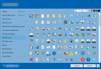 CustomizerGod to program do dostosowywania systemu, który zastępuje duży wybór ikon systemu Windows. Jest to szczególnie przydatne przy zmianie ikony wyświetlającej menu startowe lub pasek zadań. Umożliwia użytkownikom zmianę wyglądu wszystkich tych ikon z jednego centralnego miejsca. Można go bezpłatnie pobrać i jest dostępny jako pojedynczy plik wykonywalny. Jest kompatybilny ze wszystkimi wersjami nowoczesnego systemu Windows i nie wymaga żadnych specjalnych narzędzi.